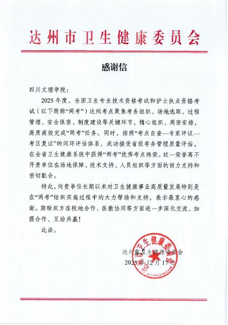 近日,达州市卫生健康委员会向四川文理学院发来感谢信,对学校在2025年度全国卫生专业技术资格考试和护士执业资格考试达州考点工作中的协作支持表示衷心感谢。此次由市卫健委承办的“两考”达州考点,成功获评全省“两考”优秀考点。